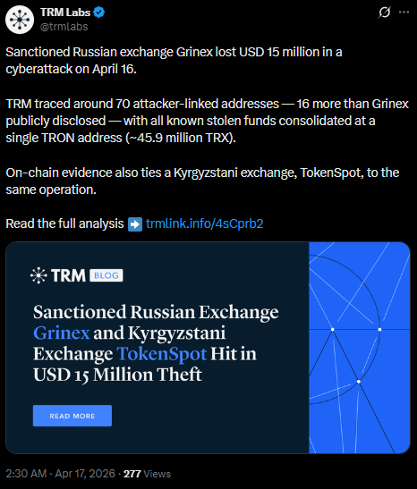 TRM Labs also noted that TokenSpot, another Kyrgyzstan-based exchange with on-chain links to Grinex, may have been indirectly affected. Two wallets associated with TokenSpot transferred roughly $5,000 to the same consolidation address used in the Grinex breach. TokenSpot later reported technical maintenance on April 15, followed by the restoration of full operations the next day.