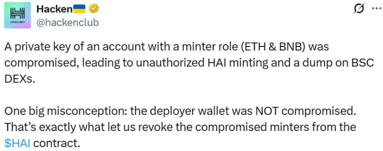 In an official post on X, Hacken revealed that the leaked private key was tied to a minting account on both Ethereum and BNB Chain. This access enabled the attacker to illegitimately create and sell massive amounts of HAI on decentralized exchanges. The token contract’s minting privileges have since been revoked, and the compromised wallet neutralized.