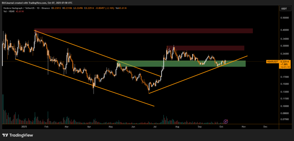 On the daily chart, HBAR has been trading within a rising channel since July, after successfully breaking out from a prolonged descending pattern that lasted through the first half of 2025. The token recently bounced from the $0.21–$0.22 support zone, highlighted as a key demand region, and is now testing resistance near $0.23–$0.24.