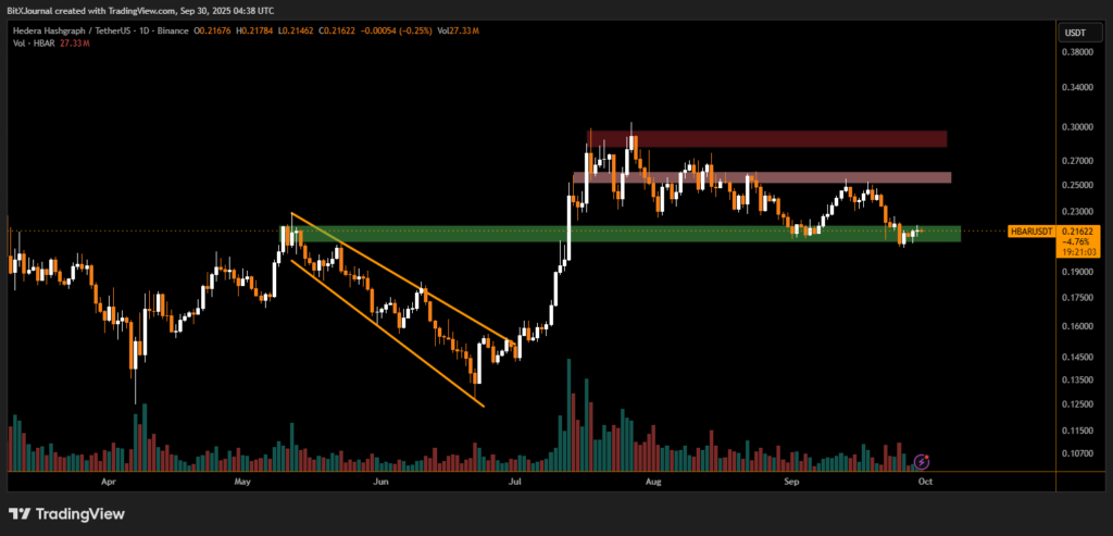 The chart also shows that HBAR previously broke out of a falling wedge pattern in June, which led to its sharp summer rally. Traders are now watching for a repeat setup, where sustained strength could trigger a fresh leg higher.