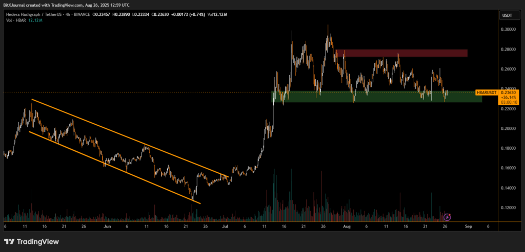 The 4-hour chart shows HBAR dipping to $0.223, touching the lower end of the green support band between $0.222–$0.225. This zone has consistently acted as a strong accumulation region since July. The bounce from this area pushed HBAR back to $0.236, signaling renewed buying interest.