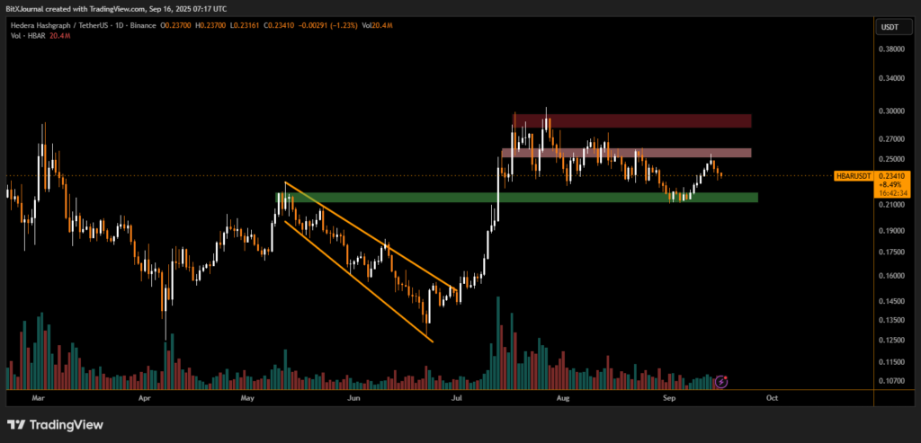 Currently, HBAR is hovering just above the $0.23 mark, which sits near a short-term pivot level. Below this, the green demand zone between $0.21 and $0.22 remains the most important support to watch.