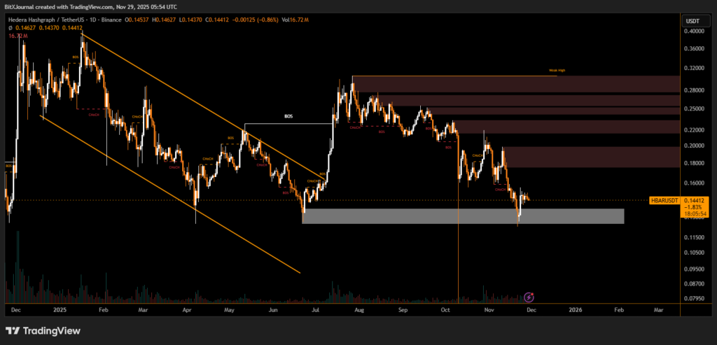 Hedera Hashgraph’s native token, HBAR, posted a modest rebound of about 2.5%, aligning with the broader crypto market’s post-Thanksgiving lift. While sentiment shows early signs of stabilization, the price chart reveals a complex structure defined by supply zones, liquidity sweeps, and repeated momentum shifts. Current technical positioning suggests that traders are watching closely for confirmation of a larger trend reversal.