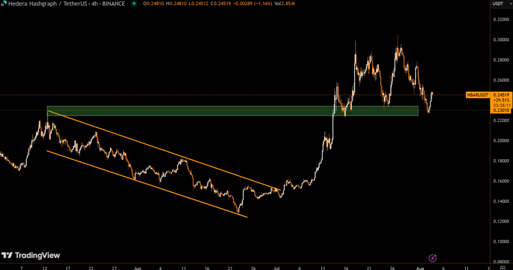 If the bearish momentum continues, HBAR may retest the $0.228 zone, which is the next notable support. A decisive break below this level could open the door toward $0.200, especially if market-wide sentiment deteriorates.