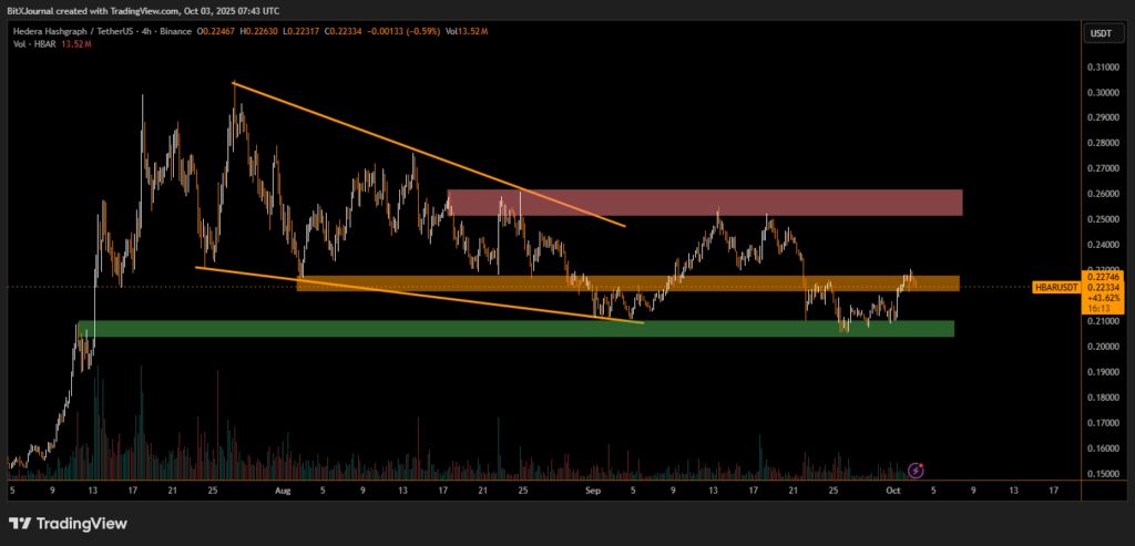 The 4-hour chart reveals that HBAR recently broke out of a descending wedge pattern, a formation often considered bullish. Buyers managed to defend the $0.21–$0.22 demand zone, where strong accumulation was visible. The rally has now pushed price action into the orange resistance band at $0.23, which has historically acted as a supply area.