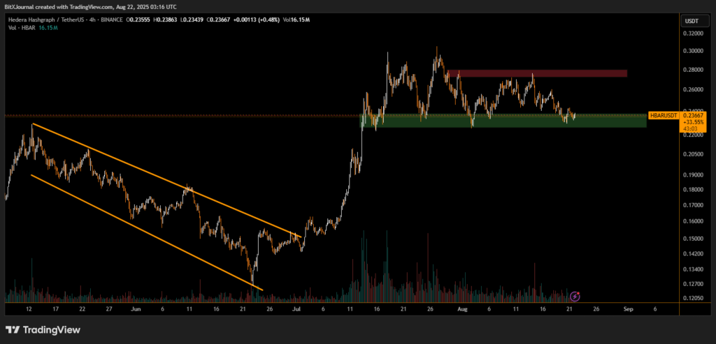 “The support region between $0.22 and $0.24 is crucial for maintaining bullish momentum,” noted  BITX technical analyst monitoring the move. “If HBAR sustains above this level, the next upside target could be around $0.28, where heavy resistance remains.”