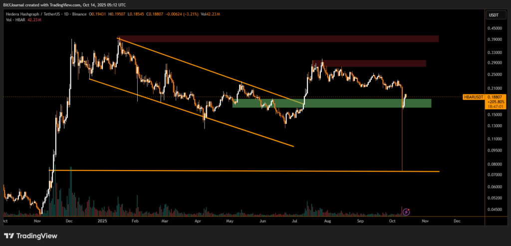 Chart data shows HBAR’s sharp bounce coincided with a notable spike in trading volume, indicating renewed interest and aggressive bottom buying. The price structure now mirrors a V-shaped recovery, with the asset holding firmly within a green demand zone that stretches between $0.16 and $0.19.