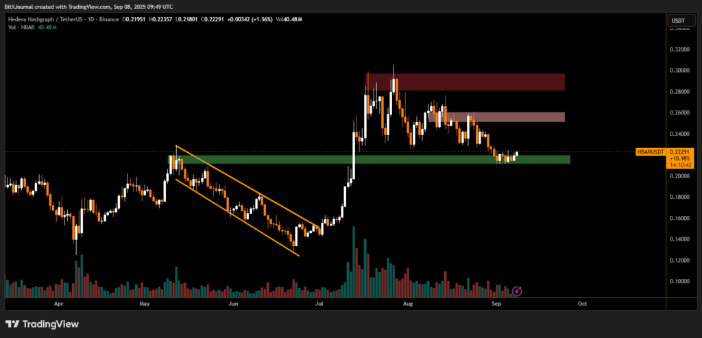 The chart highlights a strong rebound from July’s descending channel, where HBAR fell sharply before recovering. Price action now shows consolidation above the green demand zone, signaling that buyers are defending support with consistency.