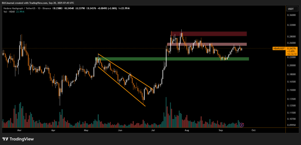 “HBAR is consolidating after a strong mid-summer breakout. The $0.21 support is crucial — a breakdown could open the door toward $0.18, but a recovery above $0.27 might reignite bullish momentum,” said BITX digital asset strategist.