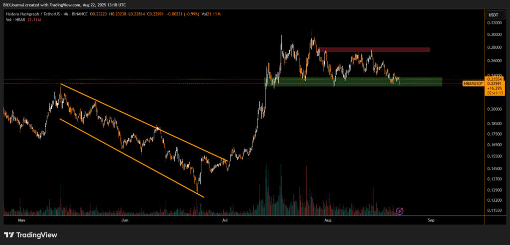 Over the past months, HBAR has demonstrated sharp volatility. After breaking out of a prolonged downward channel in June, the token rallied strongly, touching resistance near $0.28 before retracing. Currently, the price consolidates in a defined range between $0.23 support and $0.28 resistance, making this level a decisive battleground for buyers and sellers.