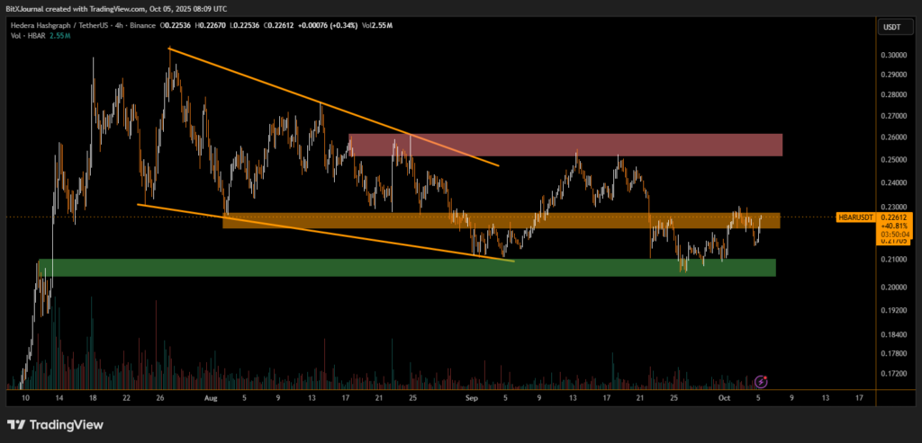 HBAR’s price action suggests a period of accumulation below a critical resistance area, as seen on the chart. After breaking out from a descending wedge pattern in mid-September, the token entered a sideways consolidation phase. Currently, $0.23 acts as a short-term resistance, aligning with a previously established supply zone where sellers have historically stepped in.
