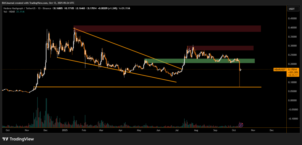 The daily chart shows HBAR breaking below its short-term consolidation range, marked by the green support zone between $0.19 and $0.21, before sharply rebounding from a key historical level near $0.10, a price area last tested in early 2024.