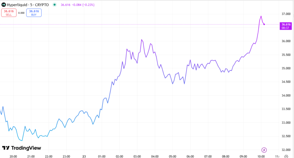 The HYPE token surged over 20% in the past 24 hours, crossing $35 for the first time, outperforming major cryptocurrencies and DeFi tokens.