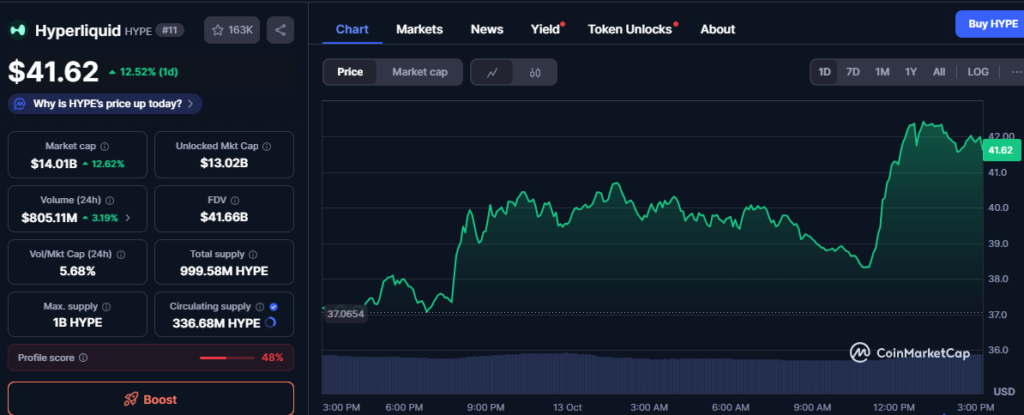 The market reacted swiftly to the development. HYPE, Hyperliquid’s native governance and staking token, rose 13.4% in the past 24 hours to around $42, giving it a market capitalization of $14.1 billion, based on CoinMarketCap data.
