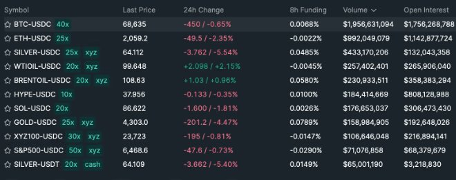 Trading activity on Hyperliquid shows a growing shift toward commodity-linked perpetual futures, with oil and silver contracts attracting more volume than major crypto assets like XRP and Solana.
