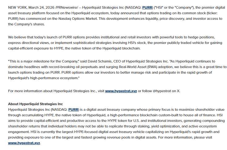 Hyperliquid Strategies Inc has introduced options trading for its common stock PURR on the Nasdaq Options Market, aiming to enhance liquidity and improve price discovery. The company said the addition of options gives investors greater flexibility to manage risk while maintaining exposure to its token-focused treasury model.