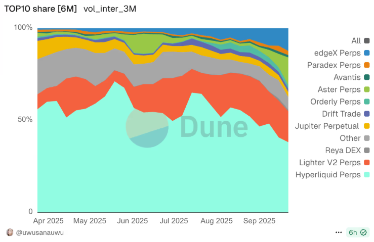 According to data from pseudonymous Dune Analytics researcher @uwusanauwu, Hyperliquid’s share of trading volume has collapsed from 71% in May to just 38% today. In the same period, Lighter (backed by a16z) and Aster (backed by Binance Labs) have seen their market shares surge to 16.8% and 14.9%, respectively.