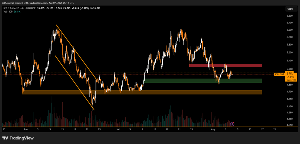 ICP had surged above $6.30 in late July before entering a descending correction pattern, now visible as a consolidation between defined resistance near $5.30–$5.40 and the aforementioned support. The red zone overhead remains a critical resistance area — one that bulls need to reclaim to restore momentum.