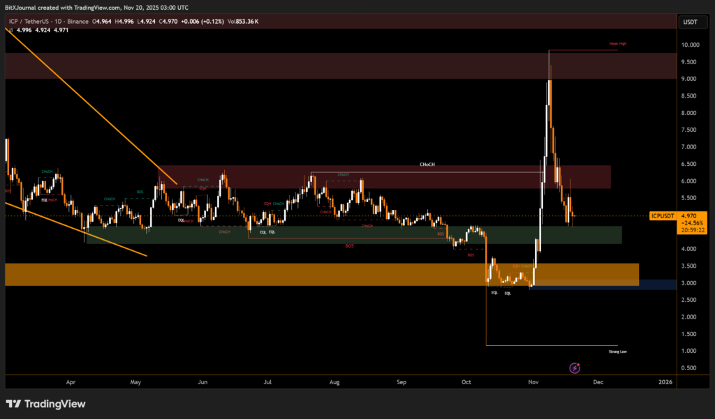“The wick above $5.17 shows clear absorption. ICP swept liquidity, tapped into the unmitigated supply, and rotated back into its range. Until buyers reclaim the mid-$5s, this remains a consolidation market.”