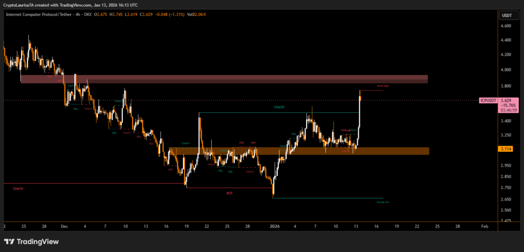 Technically, ICP is now trading near a major supply zone around $3.80–$4.00, where sellers may re-enter. However, as long as price holds above the reclaimed support level, bullish continuation remains possible.