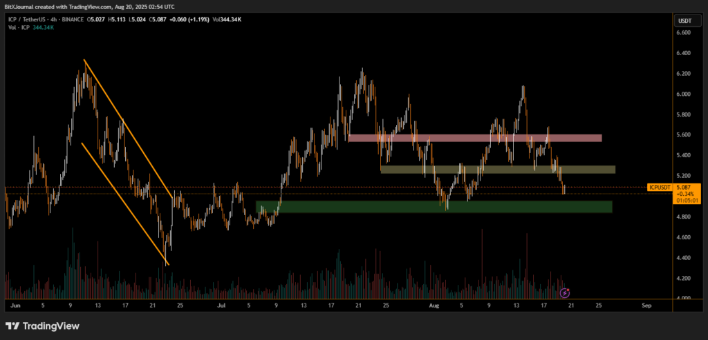 After failing to sustain gains above the $5.60–$5.70 resistance region, ICP has steadily pulled back. The token now hovers around $5.09, just above a key demand zone between $4.80 and $5.00. Technical analysts caution that a decisive break below this range could trigger further declines toward $4.50.