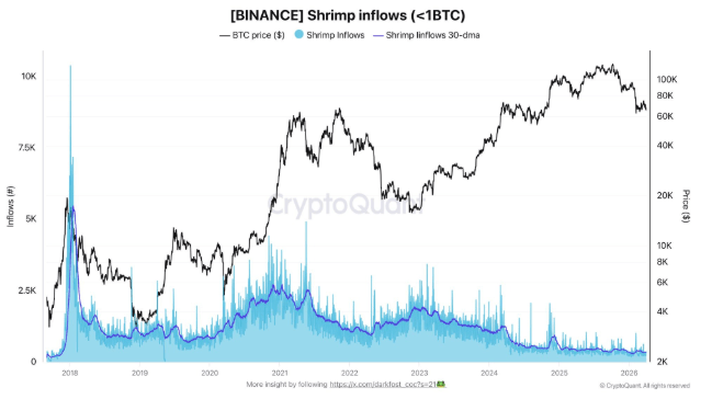 Data from analyst Darkfost shows retail activity on platforms like Binance has dropped to a nine-year low, with inflows from wallets holding less than 1 BTC reaching record lows. Some retail capital may have rotated into equities and commodities, which have recently performed strongly.