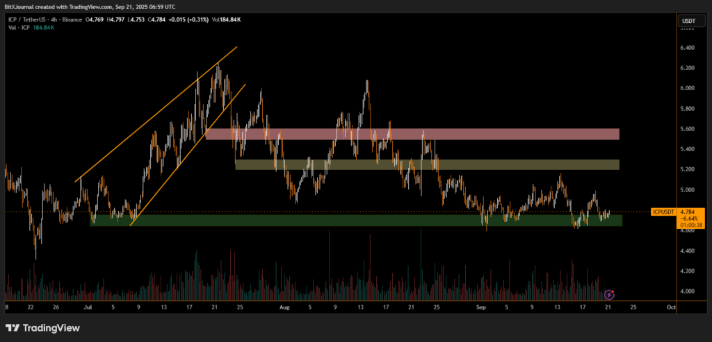 The 4-hour chart shows that ICP has been consolidating within a wide range after peaking above $6.50 in July. The token fell sharply, breaking below its rising wedge pattern, and has since tested the $4.70–$4.80 demand zone multiple times.