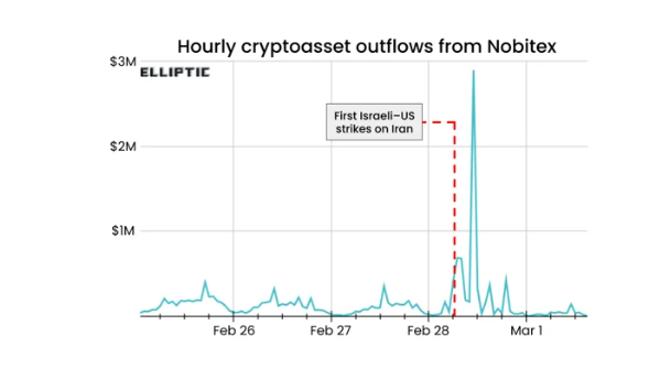 Blockchain analytics firm Elliptic reported that withdrawals from Nobitex jumped more than 700% within minutes of the initial strikes, surpassing $500,000 almost immediately. Outflows later climbed to nearly $3 million in a single hour.