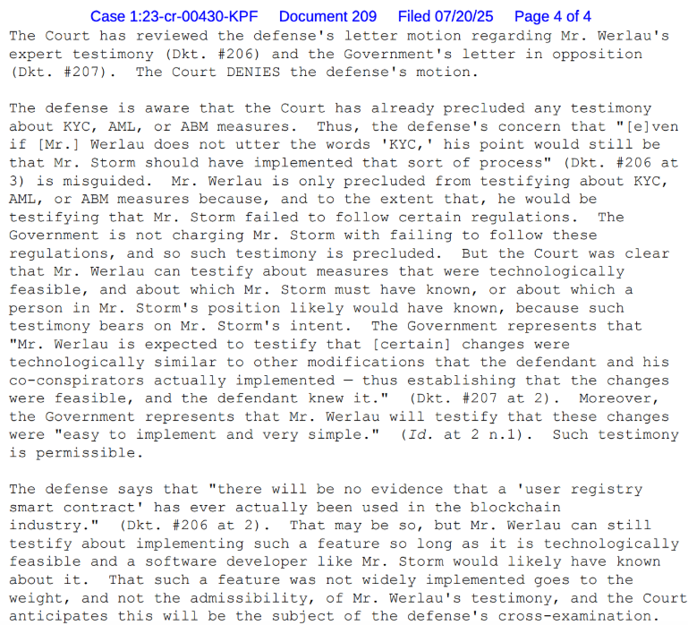 Storm’s defense team had filed a motion to exclude Werlau’s testimony, claiming there is no precedent for using a “user registry” in blockchain. However, Judge Failla dismissed the motion, stating that the testimony is allowed as long as it focuses on feasibility, not actual implementation.