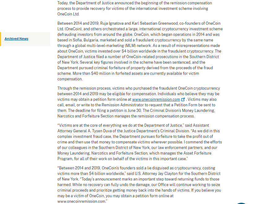 The United States Department of Justice has launched a compensation process aimed at reimbursing victims of the massive OneCoin fraud, which caused billions of dollars in losses worldwide. Officials confirmed that more than $40 million in forfeited assets is now available for distribution to individuals who purchased OneCoin between 2014 and 2019 and recorded a net financial loss.