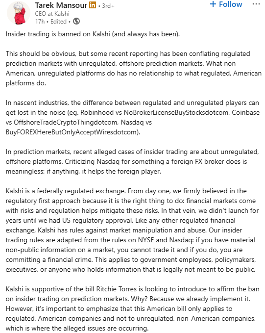 Mansour also drew a clear line between regulated American prediction markets and unregulated, offshore platforms. Recent concerns followed a high-profile case where a single account reportedly earned $400,000 by betting on the ousting of Venezuelan President Nicolás Maduro, raising insider trading alarms. According to Mansour, such incidents are occurring outside the U.S. regulatory framework.