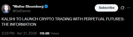 Kalshi operates under regulation from the Commodity Futures Trading Commission (CFTC), positioning it as a compliant U.S.-based alternative to offshore crypto derivatives platforms. Industry developments suggest regulators are increasingly open to bringing perpetual futures trading into regulated domestic markets.