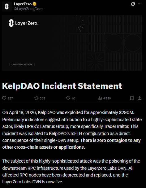 LayerZero reported that the $292 million exploit affecting Kelp DAO on April 18 is likely connected to the North Korean hacking collective Lazarus Group, specifically its subgroup known as TraderTraitor.