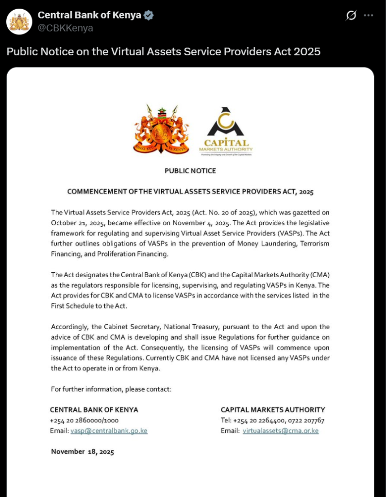 In a joint statement, both agencies emphasized: “Currently, CBK and CMA have not licensed any VASPs under the Act to operate in or from Kenya. Companies claiming authorization are operating illegally.”