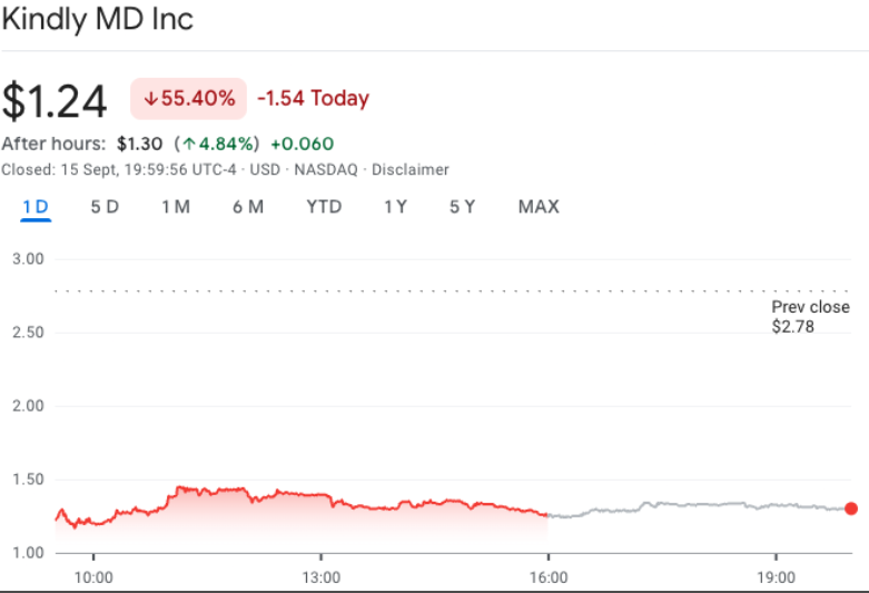 Investors responded by dumping shares. KindlyMD closed at $1.24, down from $2.78 on Friday, before bouncing slightly in after-hours trading with a 4.8% gain. The stock is now at its lowest level since February, months before the firm announced its Bitcoin accumulation plan and merger with Nakamoto Holdings, Bailey’s investment company.
