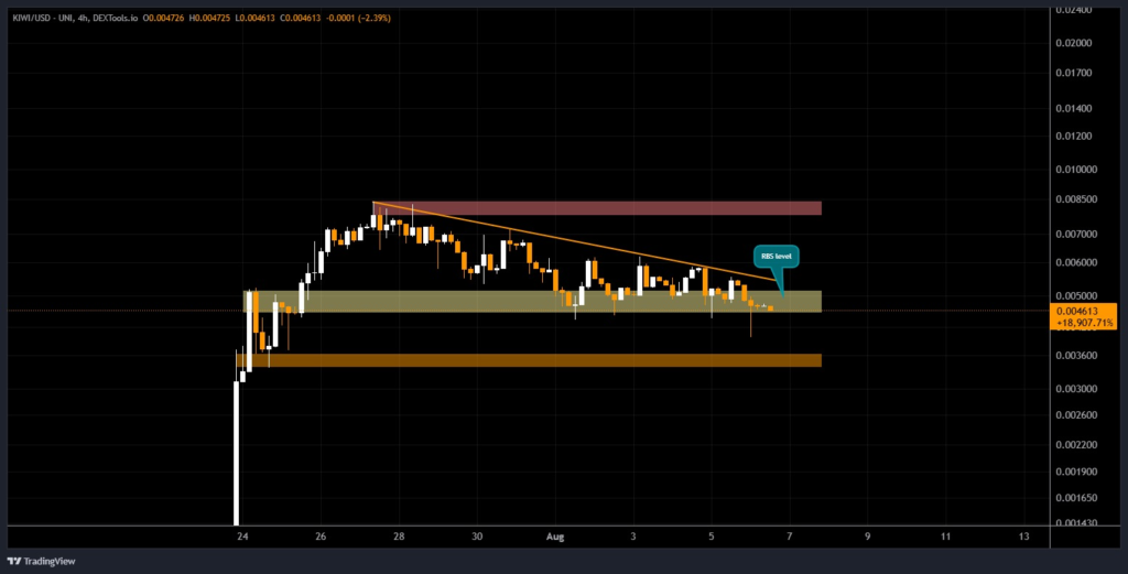 Since peaking near the 0.0085 zone, KIWI has formed a consistent series of lower highs. A well-defined descending trendline is acting as dynamic resistance, preventing any meaningful bullish breakout.
