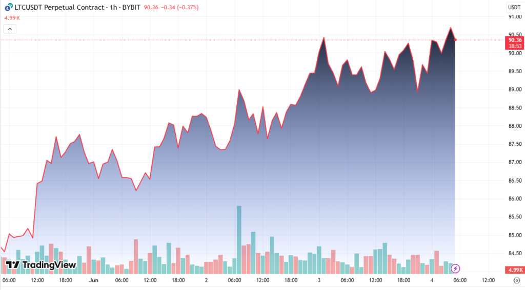 LTC touched a session high of $90.46, breaking past the psychologically important $90 barrier before retreating slightly to end the session around $89.32. The breakout came during early trading hours and was fueled by higher lows on the chart, indicating sustained bullish pressure.