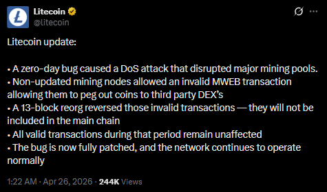 The Litecoin Foundation stated that the vulnerability has now been fully patched and that invalid transactions were erased from the blockchain history, while legitimate transactions remained intact. This marks the first confirmed attack targeting MWEB since it was introduced through a soft fork in May 2022.