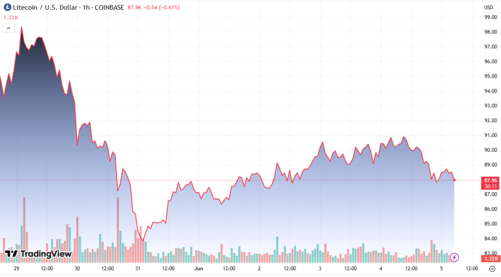 Despite the formation of a bearish head-and-shoulders pattern, Litecoin is maintaining stability around $88.58–$89.00. The price briefly dipped to $88.92 over the past 24 hours but quickly rebounded, suggesting that buyer interest is clustered near this key support level.