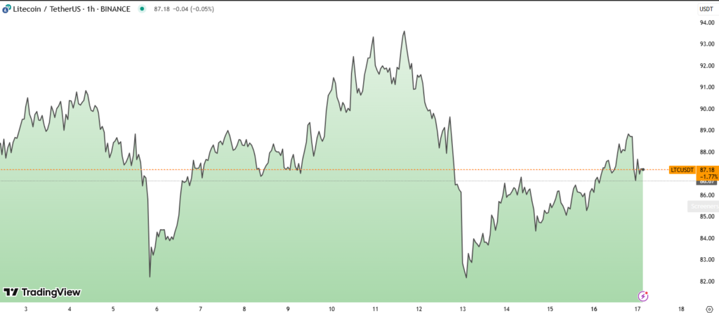 Litecoin rose from $85.05 to $88, marking a 2%+ gain as optimism builds around the approval of a spot Litecoin ETF.