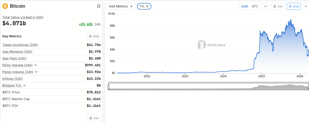 Momentum in Bitcoin-based decentralized finance continues to build. Data shows Bitcoin’s total value locked in DeFi stands near $2.93 billion, compared with an overall market capitalization of about $1.4 trillion.