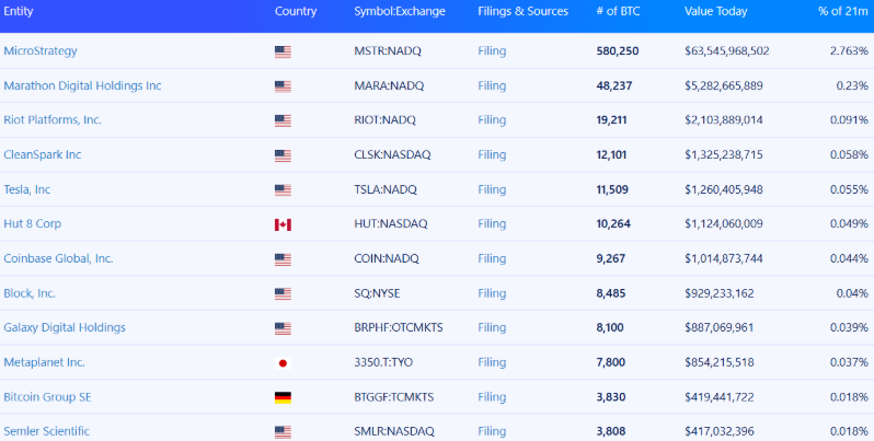 As of May 27, MARA holds 48,237 BTC, valued at over $5.28 billion, according to Bitbo data. This makes the company the second-largest corporate holder of Bitcoin, commanding over 0.23% of the total BTC supply.
