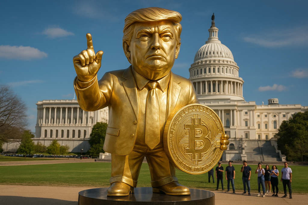 A group of memecoin enthusiasts erected a 12-foot golden statue of President Donald Trump holding a Bitcoin near the US Capitol this week, turning heads in Washington, DC. The spectacle was organized by livestreamers on the platform Pump.fun and positioned on the National Mall, just opposite Union Square.