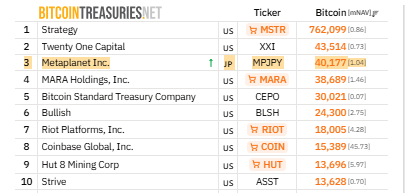 Metaplanet Surpasses MARA Holdings in Global Bitcoin Treasury Rankings