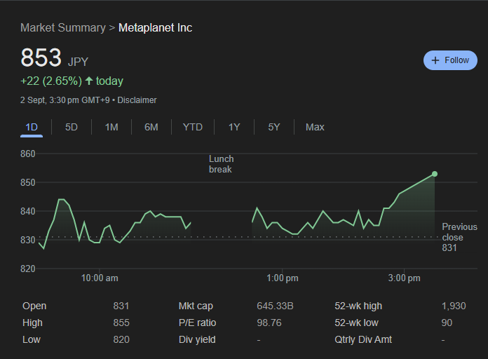 Metaplanet Inc. saw its stock rise over 2.5% to 853 yen on Tuesday after shareholders approved key corporate governance amendments during an extraordinary general meeting on September 1, 2025. The changes aim to strengthen financial flexibility and modernize corporate practices.