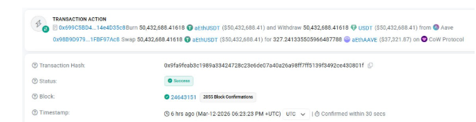 The swap involved approximately $50.4 million in Tether (USDT) that was transferred from Binance to a newly funded wallet. The user attempted to convert the entire amount into the Aave token using CoW Protocol along with the decentralized exchange SushiSwap.