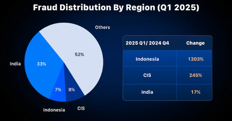 India, the CIS region, and Indonesia accounted for over half of the flagged accounts globally, highlighting key geographies for rising crypto abuse.
