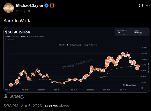 In an X post on Sunday, Saylor shared a screenshot from StrategyTracker with the caption “Back to Work,” a signal he has frequently used ahead of announcing new Bitcoin acquisitions. The firm’s last purchase was reported on March 23, when it bought approximately $77 million worth of Bitcoin at an average price of $74,326 per coin, ending its weekly buying streak for the first time this year.