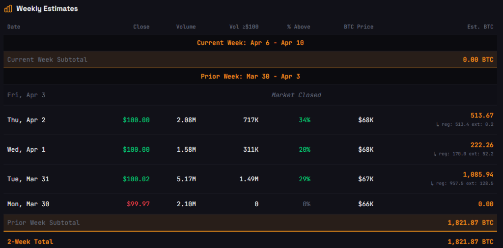 Estimates suggest the firm could acquire at least 1,821 BTC, based on funds raised during the week ending April 3. Earlier announcements also revealed plans to raise $44.1 billion through common share and preferred stock sales to finance additional Bitcoin acquisitions.