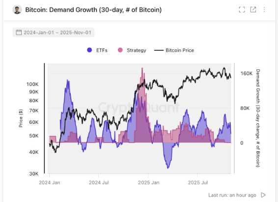 CryptoQuant data shows that both Strategy and U.S. spot Bitcoin ETFs have been key drivers of institutional demand, and their recent slowdown has coincided with Bitcoin’s pullback from its October highs.